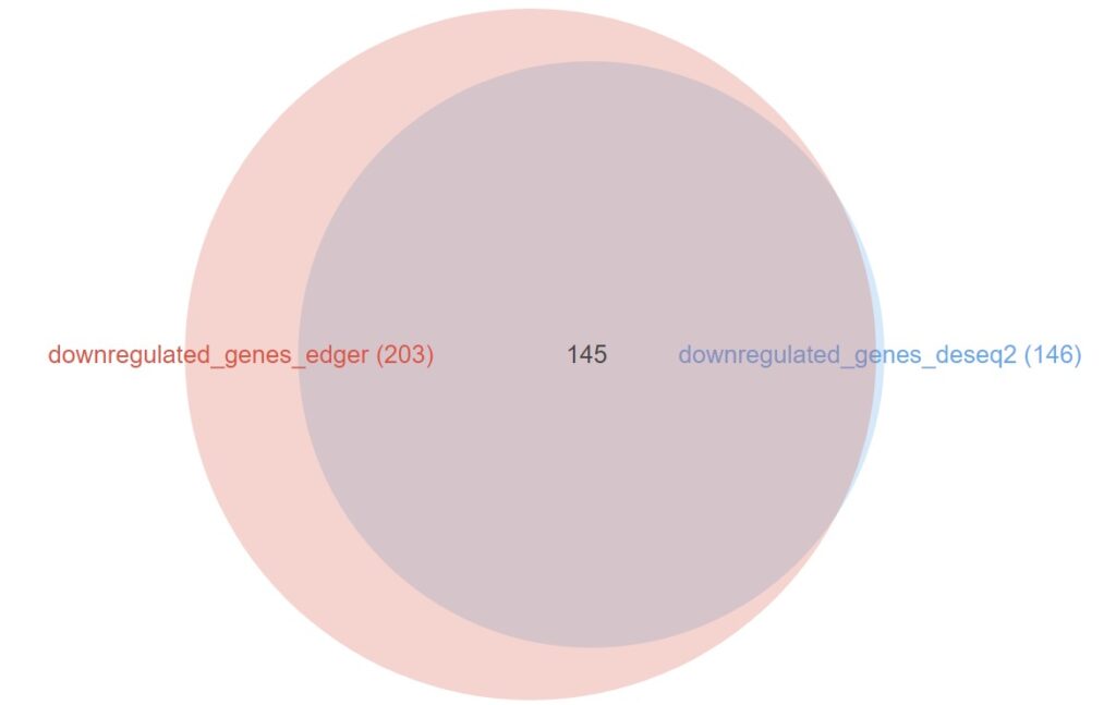 The comparison of upregulated genes (Figure 12) reveals a massive agreement between both packages: 391 out of the 400 genes identified by DESeq2 (97.7%) were also present in the edgeR list. The results for the downregulated genes (Figure 13) are even more compelling, showing a near-perfect overlap where 145 out of 146 genes from DESeq2 were shared.