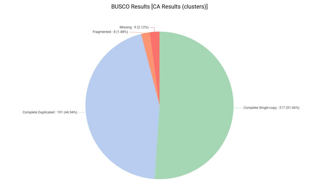 To evaluate the quality of our assembly, we performed a completeness assessment using BUSCO (Benchmarking Universal Single-Copy Orthologs) against the Viridiplantae database. BUSCO evaluates transcriptome quality by searching for a set of evolutionarily conserved genes that are expected to be present in a single copy across a specific taxonomic group.