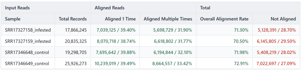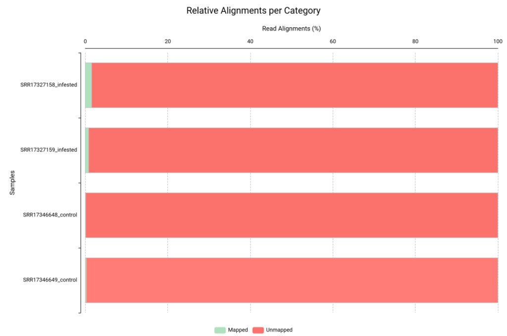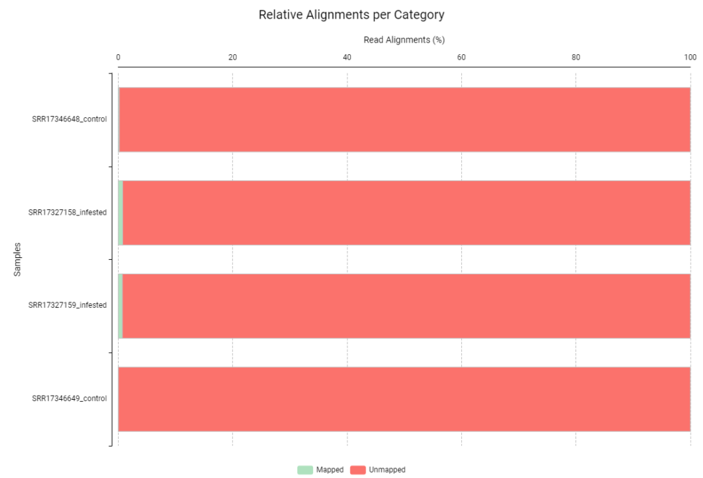 Figures 4 and 5 show the relative alignment distribution against the human and aphid genomes, respectively. In these charts, green represents reads that aligned to the contaminant reference, while red represents unmapped reads. In this specific analysis, having almost entirely red bars is a positive signal. It demonstrates that our samples contained minimal levels of human and aphid genetic material. To ensure the highest accuracy, we discarded the few reads that matched the contaminants (green) and continued the workflow exclusively with the non-aligned reads (red). By filtering our reads against the genomes of H. sapiens and B. brassicae, we ensured that the Trinity pipeline only processed plant-specific mRNA, which should prevent the formation of assembled chimeric transcripts.