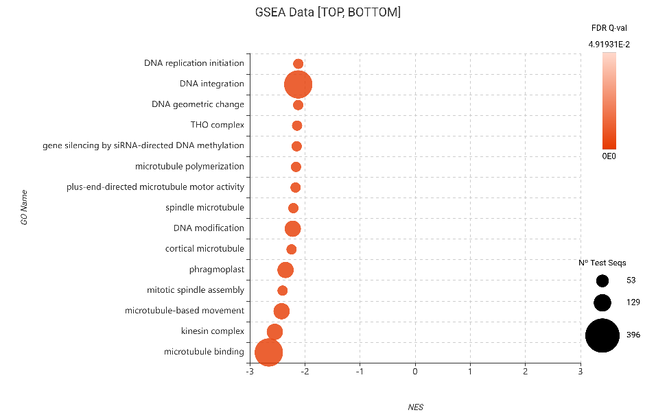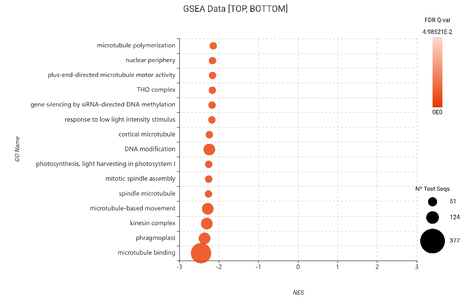 Figure 18. GSEA bubble plot for Gene Ontology terms, filtered to show the 15 most depleted categories (bottom NES) based on edgeR differential expression.