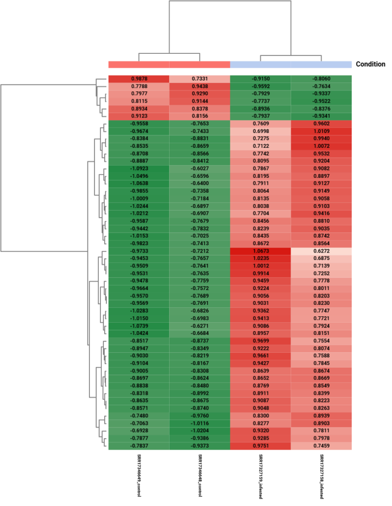 Using the same thresholds (|log2FC| ≥ 2 and FDR < 0.05), the DESeq2 pipeline identified 546 Differentially Expressed Genes (DEGs), consisting of 400 upregulated and 146 downregulated transcripts. Although the total number of DEGs is slightly lower than in the edgeR analysis (691 vs. 546), the overall biological trend remains highly consistent. Moreover, the Hierarchical Clustering Heatmap (Figure 11) clearly reproduces the distinct separation between infested and control plants.