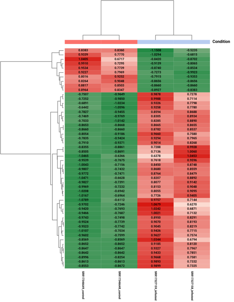 The heatmap (Figure 9) provides a clear “molecular signature” of the infestation. Most importantly, the top dendrogram shows perfect sample clustering, where replicates group strictly by condition. This visual “red vs. green” switch across the two gene blocks confirms the biological impact of the aphid.