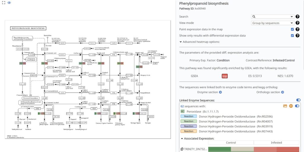 As shown in Figure 25, the pathway is “painted” with our differential expression data, highlighting a dramatic response in the late stages of the route. A standout feature is the massive upregulation of Peroxidase (EC: 1.11.1.7). The associated expression heatmap clearly demonstrates that the sequences linked to this enzyme (such as TRINITY_DN732…) are highly upregulated (deep red) in the Infested condition.