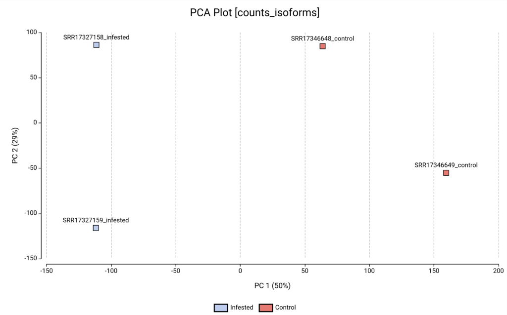 The first principal component (PC1) accounts for half of the total variance in the dataset. As shown in Figure 7, PC1 perfectly separates the Infested samples (blue) from the Control samples (red).