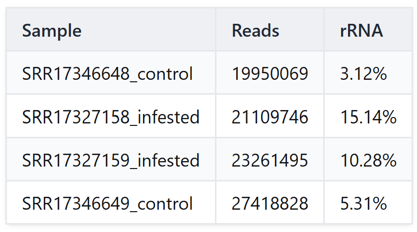 For our Rorippa indica analysis, we integrated SortMeRNA into our pipeline, which remains one of the most efficient algorithms for this task. Our results (Table 1) revealed residual rRNA levels ranging from 3.12% to 15.14%. Notably, the infested samples showed a higher percentage of ribosomal contamination compared to the controls. This finding underscores the necessity of bioinformatic depletion; by removing these millions of non-coding reads, we reduced the computational complexity and potential noise for the subsequent de novo assembly.
