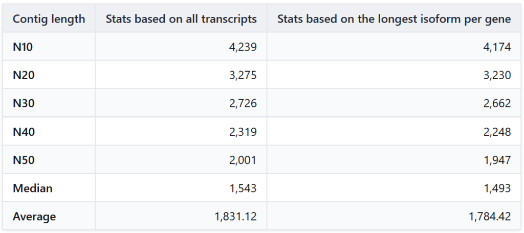To evaluate the success of our assembly, we analyzed the length distribution statistics (Table 2). The N50 value is the most widely used metric for assembly contiguity: it represents the length such that at least 50% of the total assembled bases are contained in contigs of this size or longer.