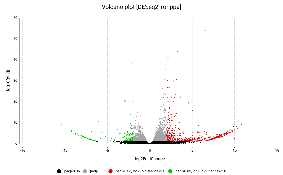 Figure 10. Volcano plot of the differentially expressed genes obtained by DESeq2, highlighting upregulated (red) and downregulated (green).