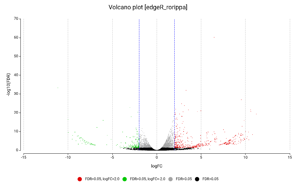 Figure 8. Volcano plot of the differentially expressed genes obtained by edgeR, highlighting upregulated (red) and downregulated (green).